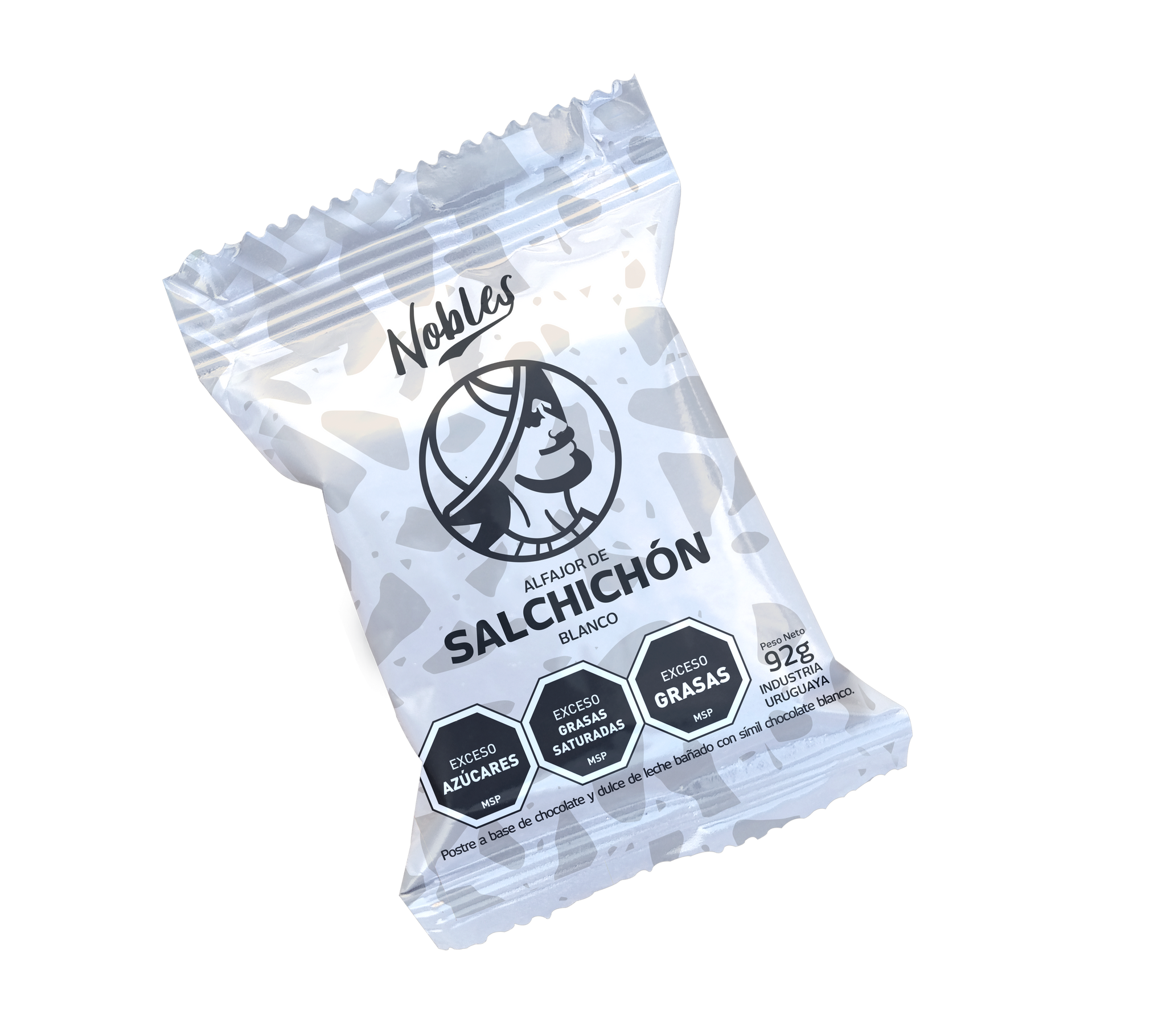 El salchichón: un clásico uruguayo unido a otro clásico uruguayo como el alfajor. En chocolate blanco y negro. Display de 8 unidades.